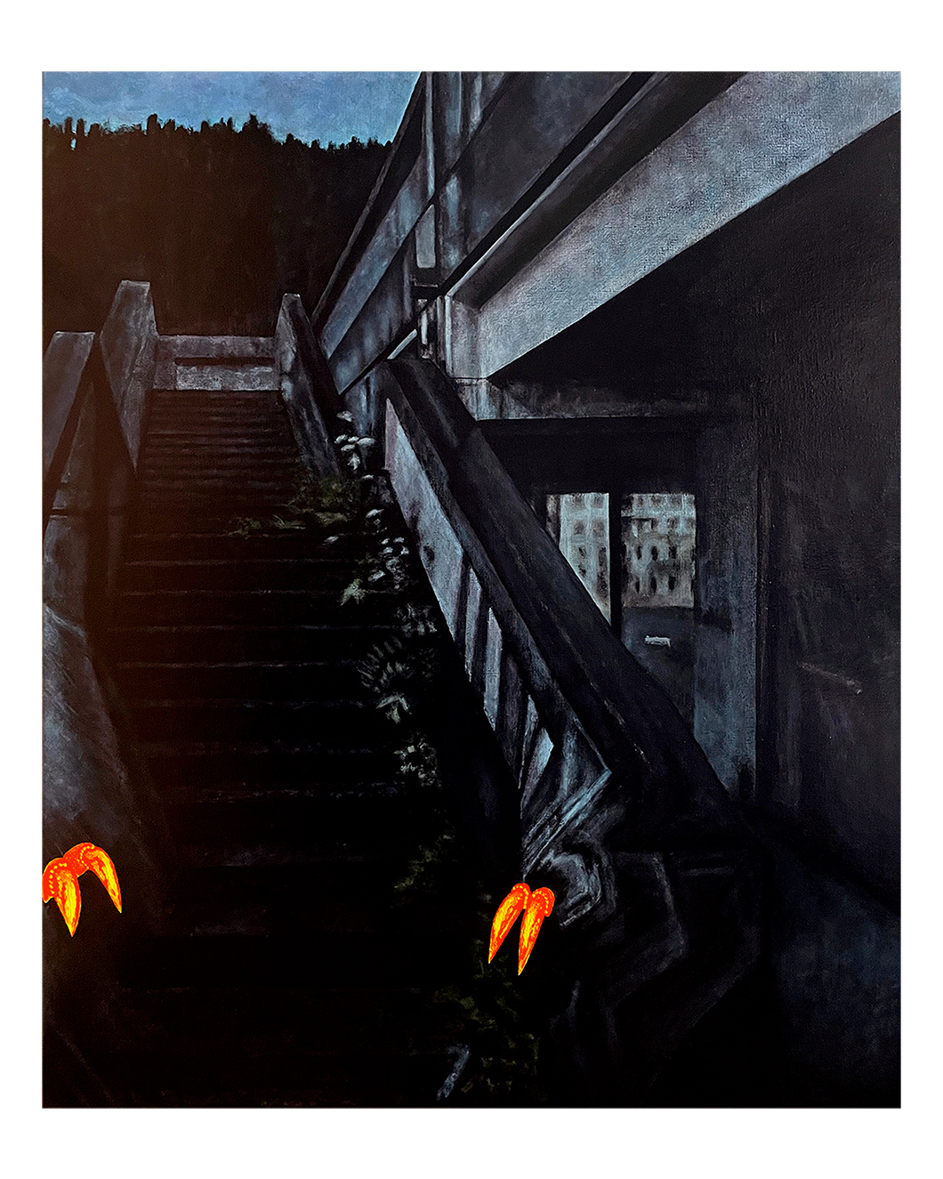 Night in Bad Gastein is a series of five acrylic works, that excavates the decadent melancholia of the paradoxical Alpine resort where bourgeois opulence has collapsed into sublime disrepair. Rooted in the artist’s summer sojourn of the pandemic 2020 with his partner, the paintings metabolize strolls through spectral corners into a visual palimpsest where architecture, history, nature, and imagination collide with both menace and play.