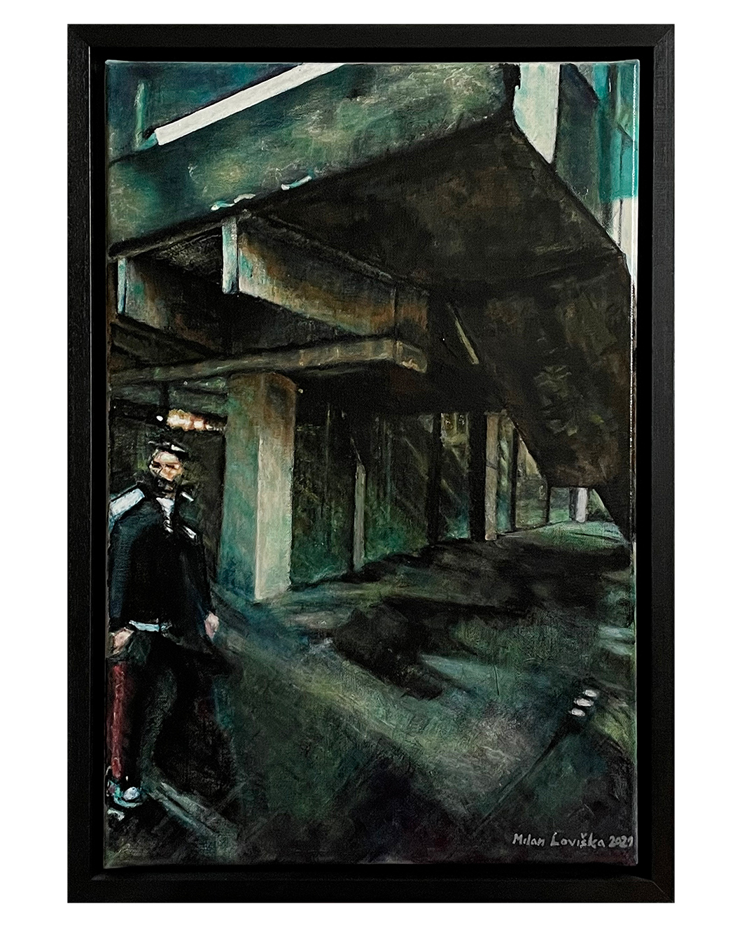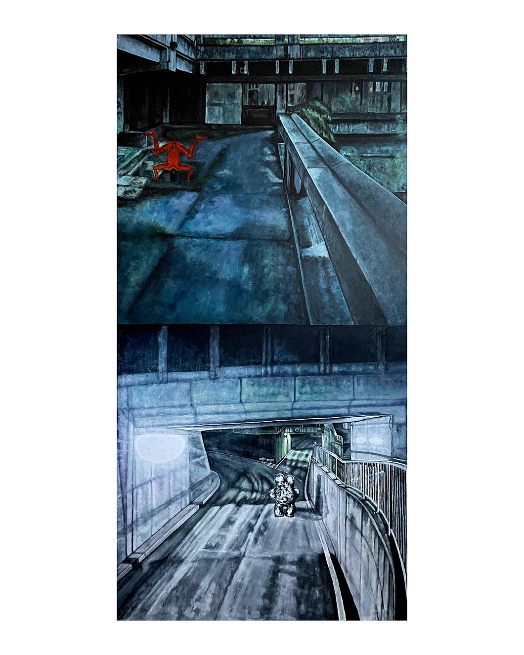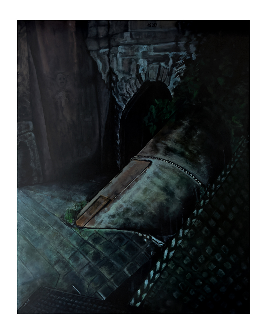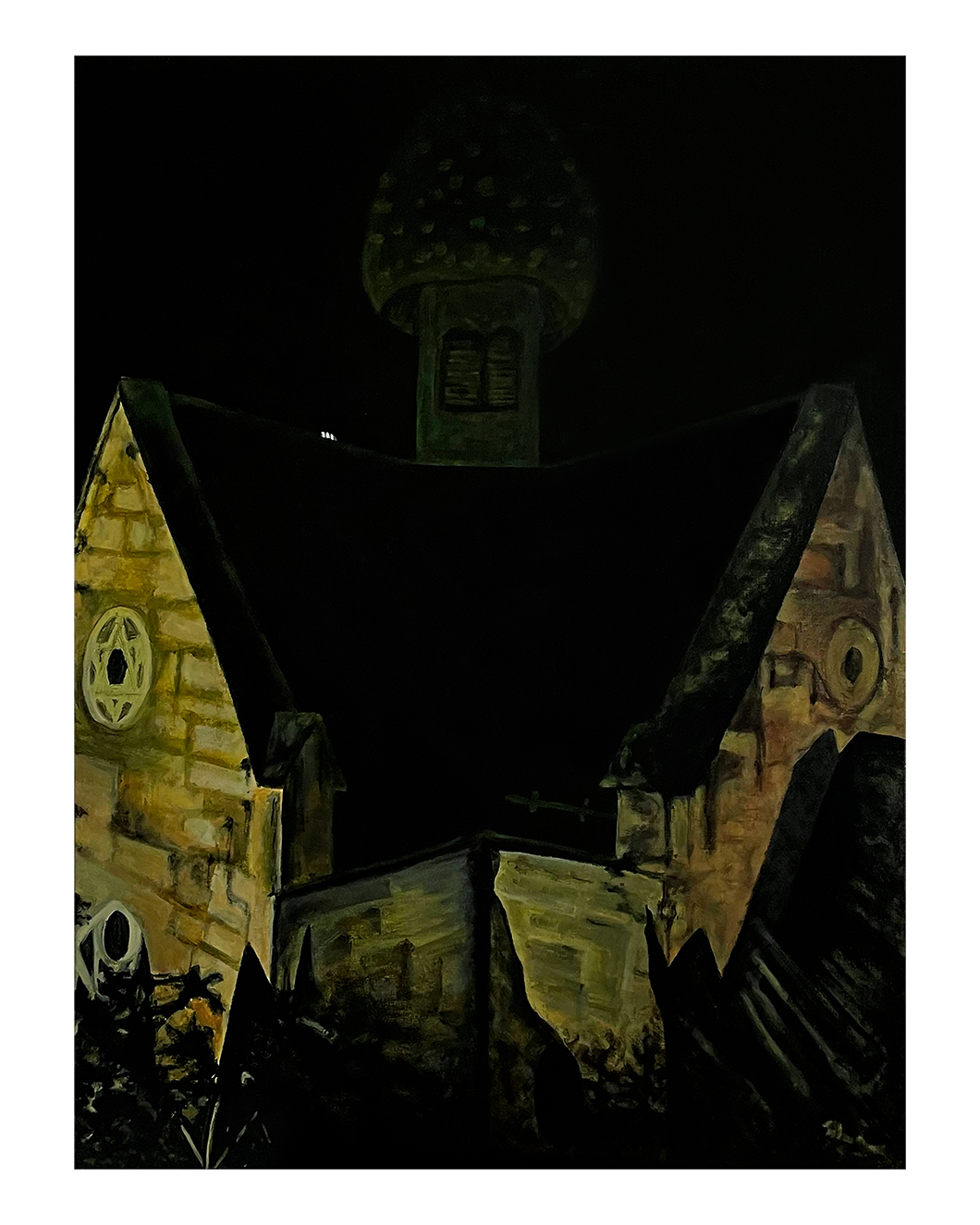 Night in Bad Gastein is a series of five acrylic works, that excavates the decadent melancholia of the paradoxical Alpine resort where bourgeois opulence has collapsed into sublime disrepair. Rooted in the artist’s summer sojourn of the pandemic 2020 with his partner, the paintings metabolize strolls through spectral corners into a visual palimpsest where architecture, history, nature, and imagination collide with both menace and play.